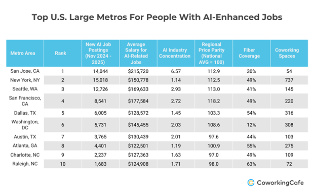 Coworking Cafe: Raleigh-Cary ranks #10 among large metros thanks to strong AI job concentration and standout fiber connectivity. Here are more details on the area’s best metrics: